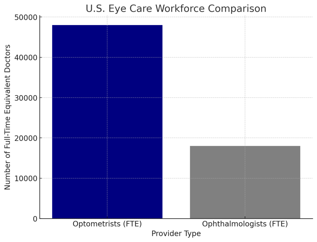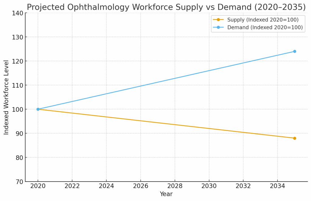 The need for ophthalmic care is growing sharply due to an aging population and rising rates of chronic eye disease. Workforce studies predict a 12–30% shortfall in ophthalmologist full-time equivalents (FTEs) by 2035 if current trends continue. And although hundreds of new ophthalmologists enter practice each year, retirements, limited residency growth, and rising patient demand are widening the gap.
